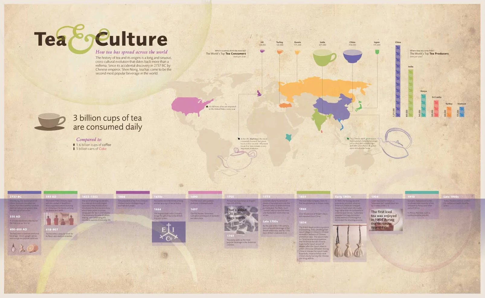 I created this infographic to be produced at an environment scale for the inside of Zen Cha tea salon in the Columbus Short North area. It illustrates a story of the origins of tea and how it has traveled across the globe.