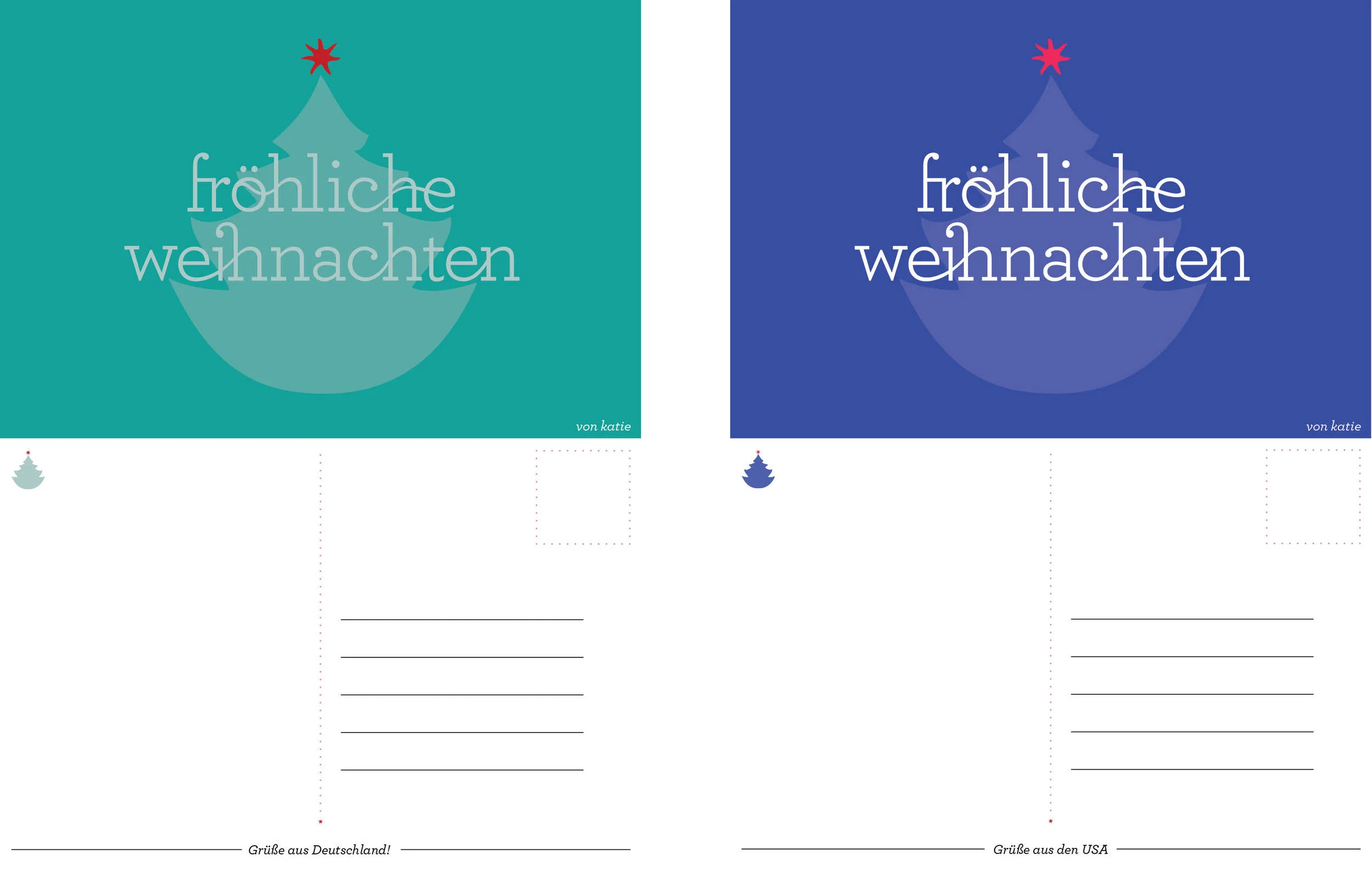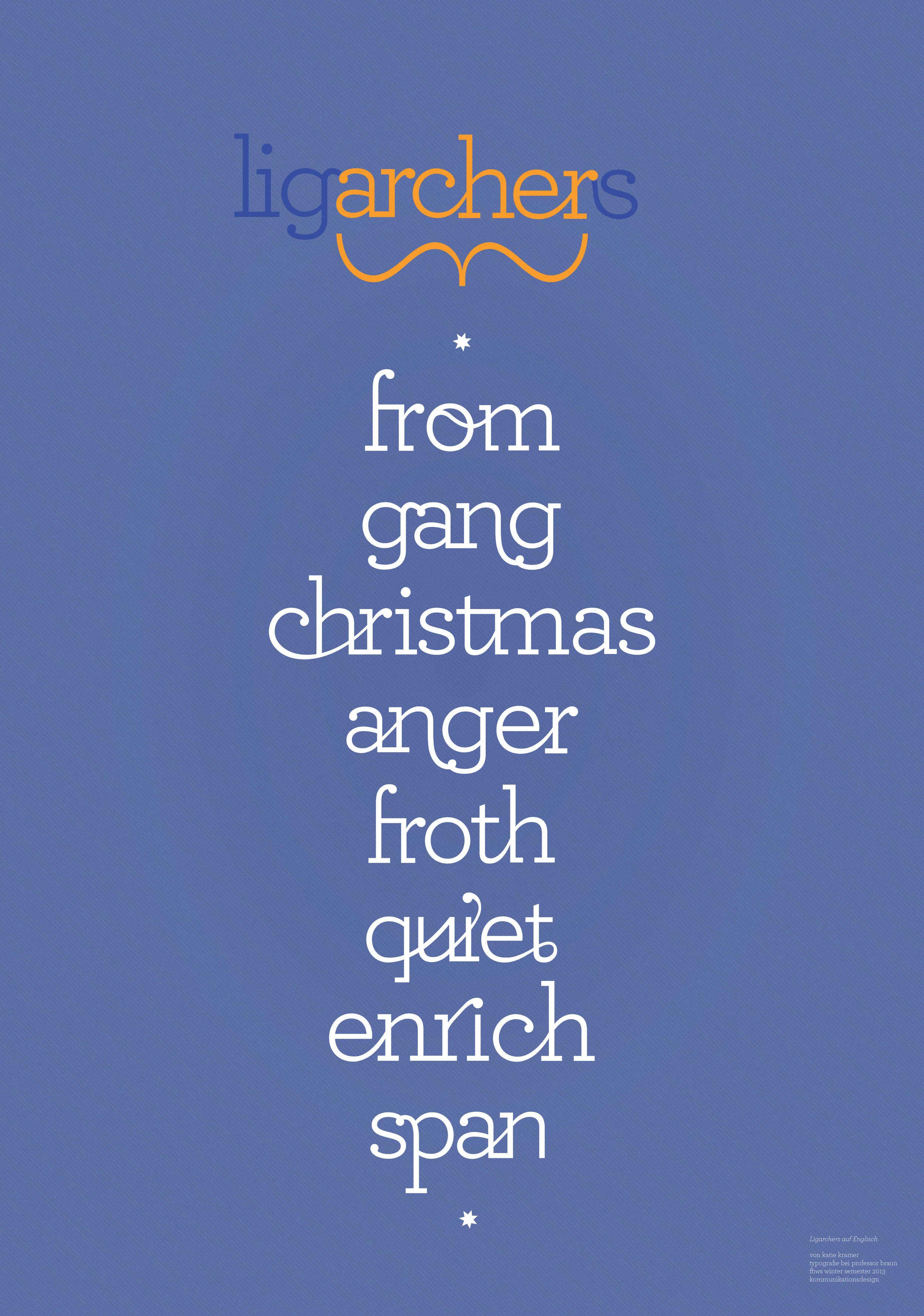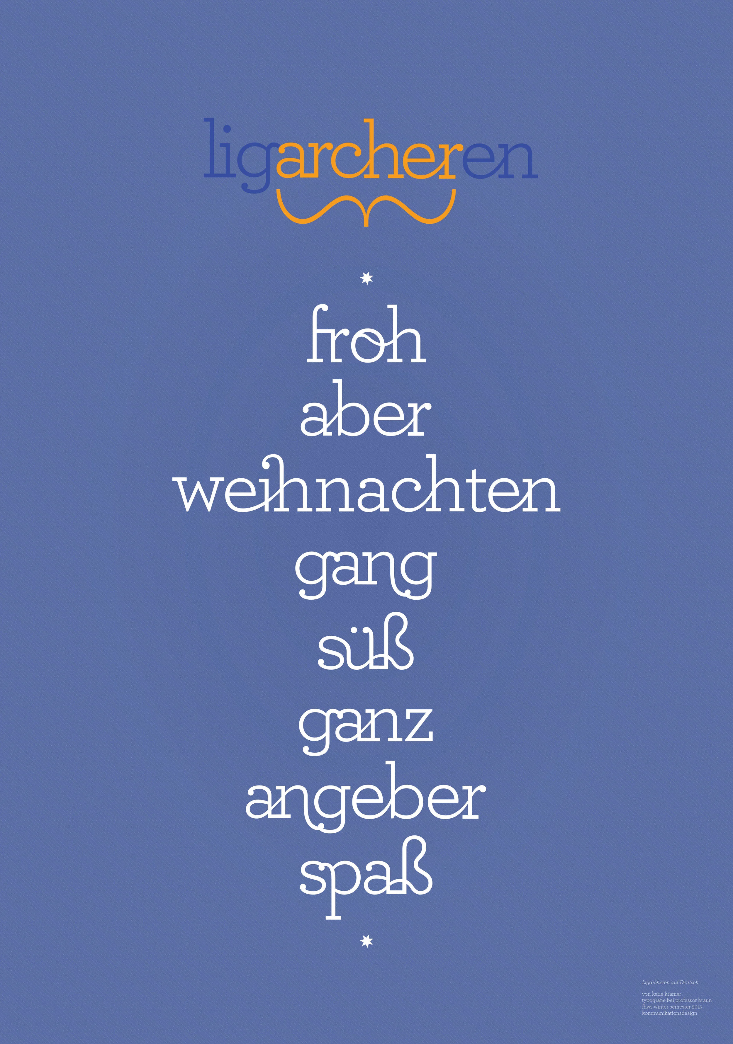 This is a poster using a collection of german words to display ligatures I made with the typeface Archer. It was near the holidays, so I also made some postcards to say "Fröhe Weihnachten!" to my friends and family back home!